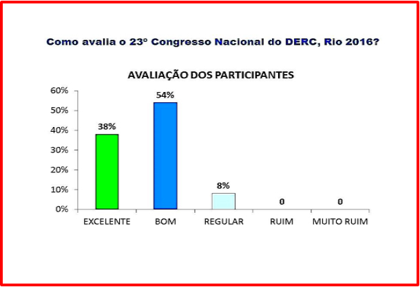 O Congresso do DERC, na cidade do Rio de Janeiro, foi muito favoravelmente avaliado pelos participantes, palestrantes ou não. A figura abaixo mostra que 92% dos que o avaliaram ficaram muito satisfeitos com a qualidade geral do grande evento do nosso DERC.